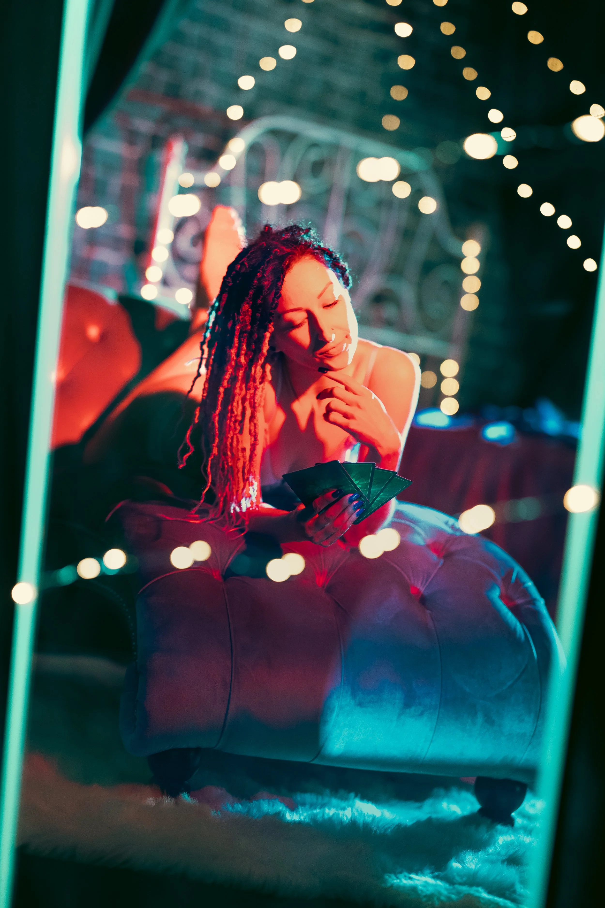 Her spirit connects deeply with her tarot cards. Different colored auras surround her.